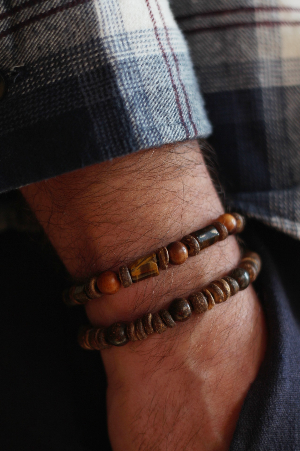 Tento náramek je vyroben z kokosového dřeva a Bronzitu.