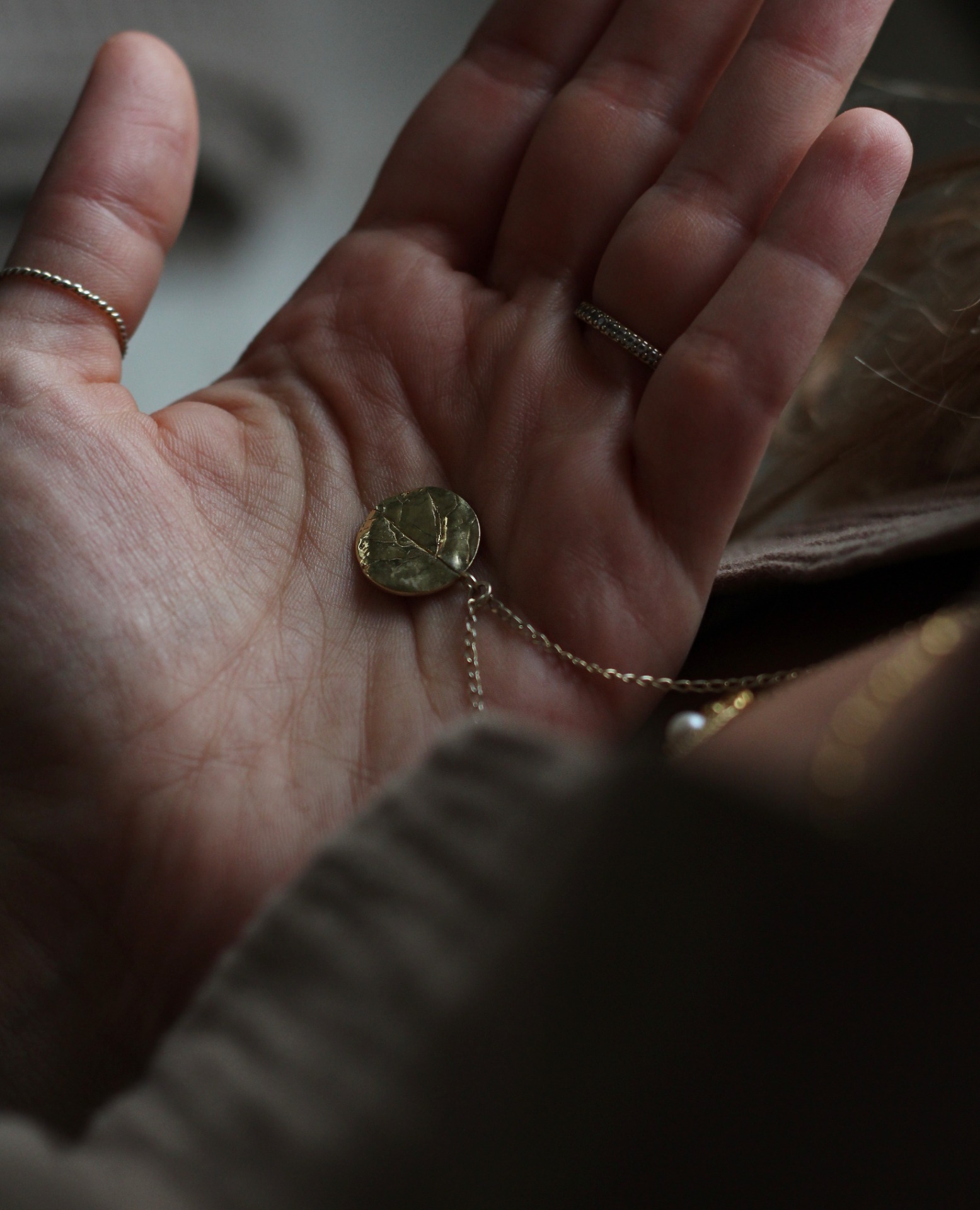Tento náhrdelník je vyroben z listového medailonku. Náhrdelník má tři nastavitelné délky 45, 55 a 60 cm. Medailonek byl vyroben na základě slisovaného živého listu, který byl vtištěn do stříbra. Každý medailonek je a bude originál. Dokonalý ve své nedokonalosti tak, jako je příroda sama.