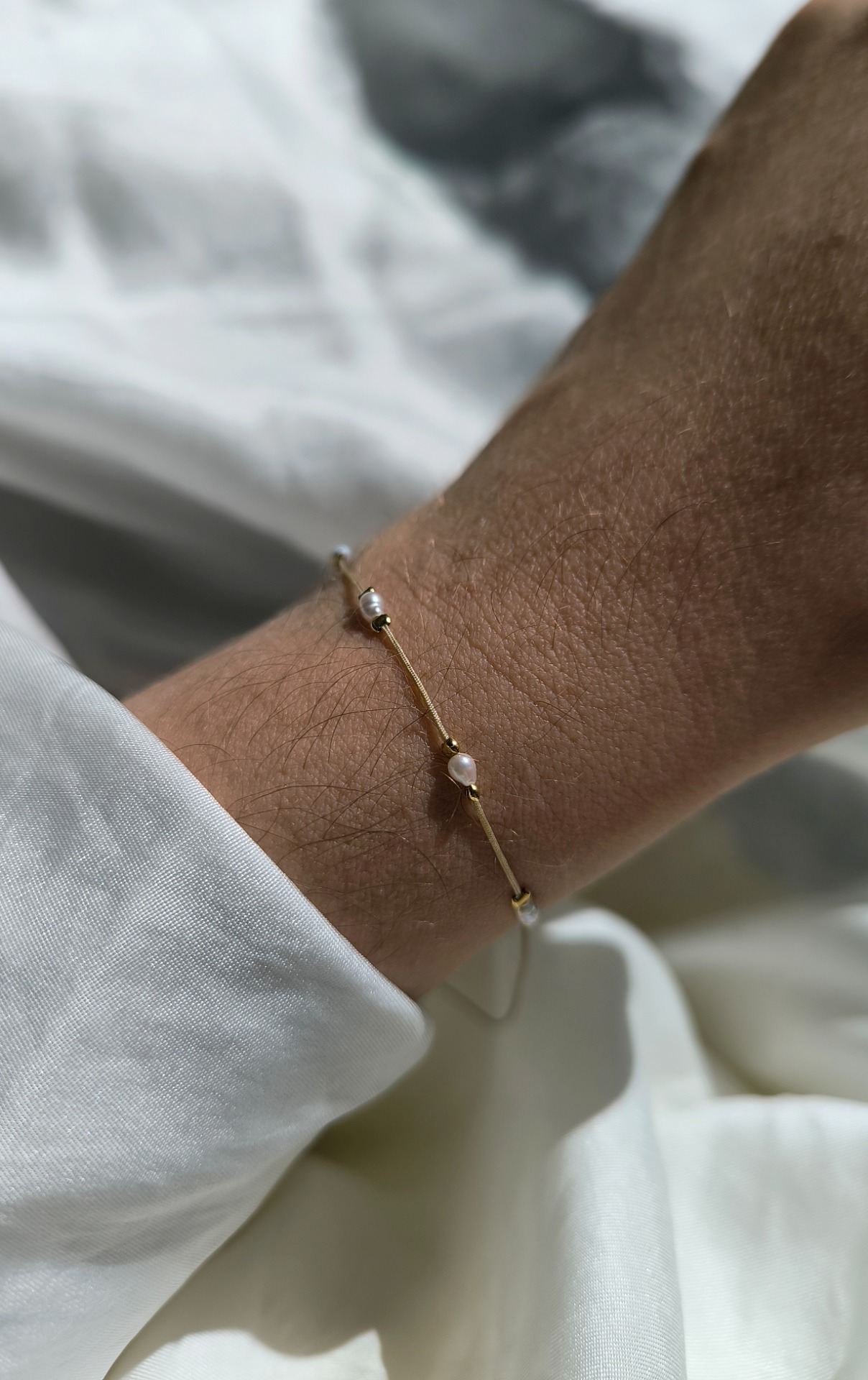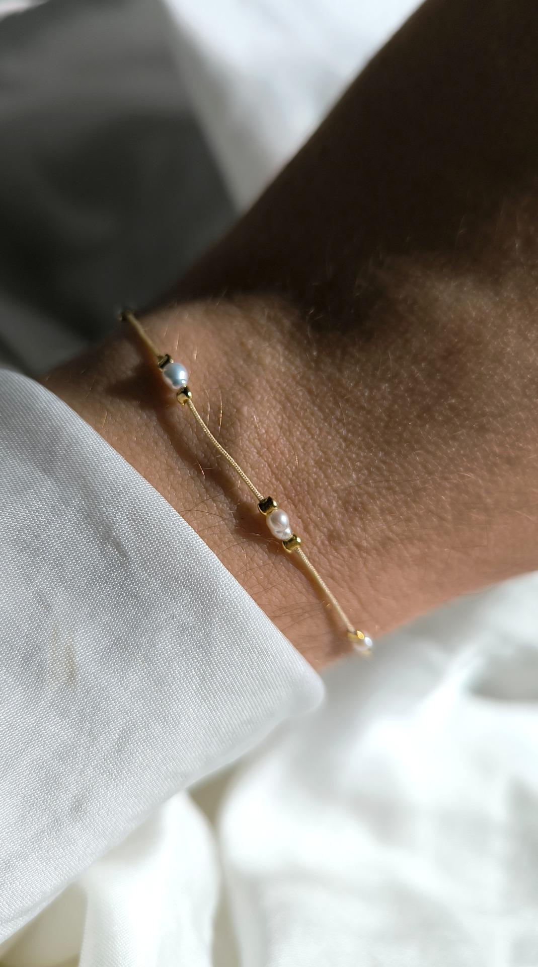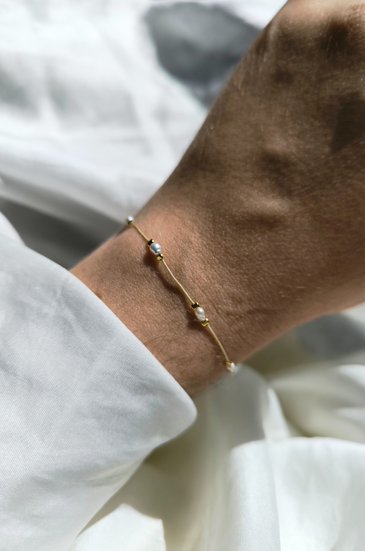 Materiál náramku: nylonová šňůrka / říční perly / stříbro 925/1000 / pozlaceno 14k zlatem