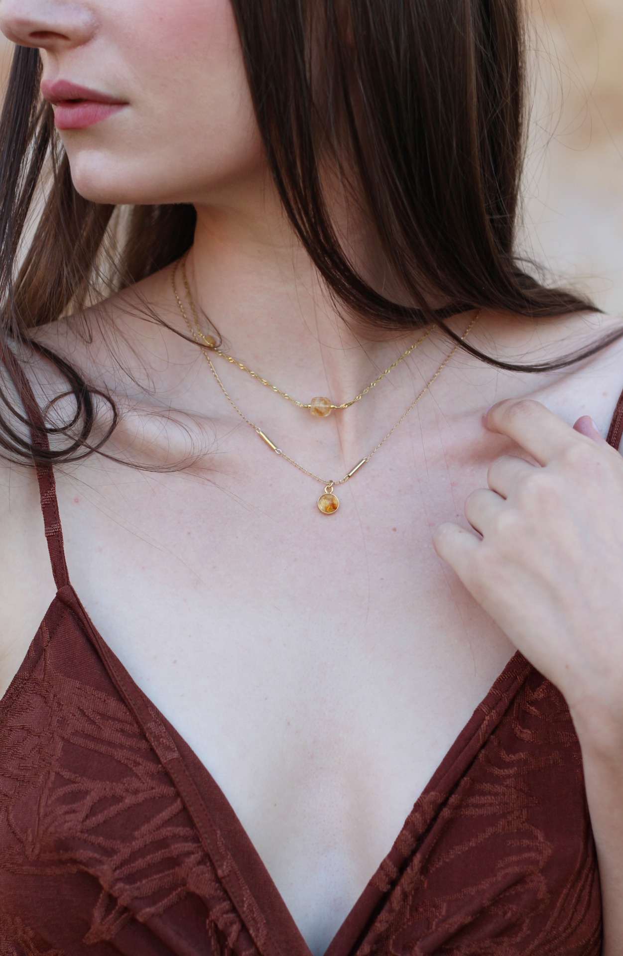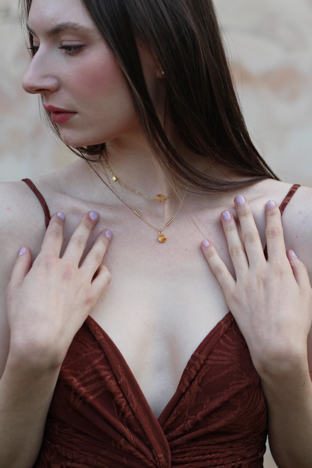 Tento náhrdelník je vyroben z pravého kusu Citrínu. Kámen je ve tvaru broušené kostičky.