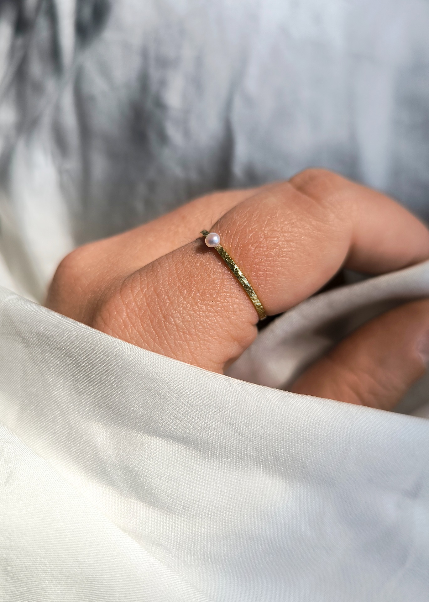Prsten je vyroben z drátu o tloušťce 1,2 mm a říční perly. Povrh je strukturovaný. Perla je o velikosti 2,5 - 3 mm.